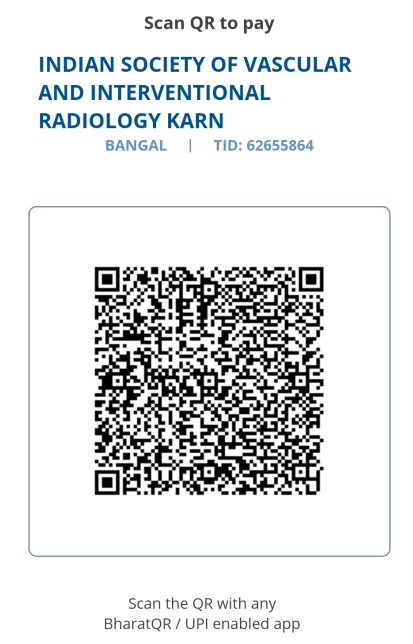 Consultants Registration Form Fees - 6500 (Including GST) On Spot - 8000 (Including GST) * Your 10 digits mobile number will considered as registration number for the conference. Name* Designation* Email Id* Phone Number* Medical Registration Number* Bank Details : Name & Address : ISVIR KARNATAKA STATE BRANCH, HDFC BANK LTD NO 99, AKSHATA TOWERS, K H ROAD, BENGLURU - 560027, KARNATAKA Account Number : 50100084770339 IFSC CODE : HDFC0001206 UPI ID : indiansocietyofvascu.62655864@hdfcbank UPI Account Name : Indian Society of Vascular and Interventional Radiology Karn Upload screenshot with Reference number of payment made* Scan below QR Code to do payment PLEASE SCAN THE QR CODE FROM ANOTHER DEVICE UPI ID: indiansocietyofvascu.62655864@hdfcbank Indian Society of Vascular and Interventional Radiology Karn